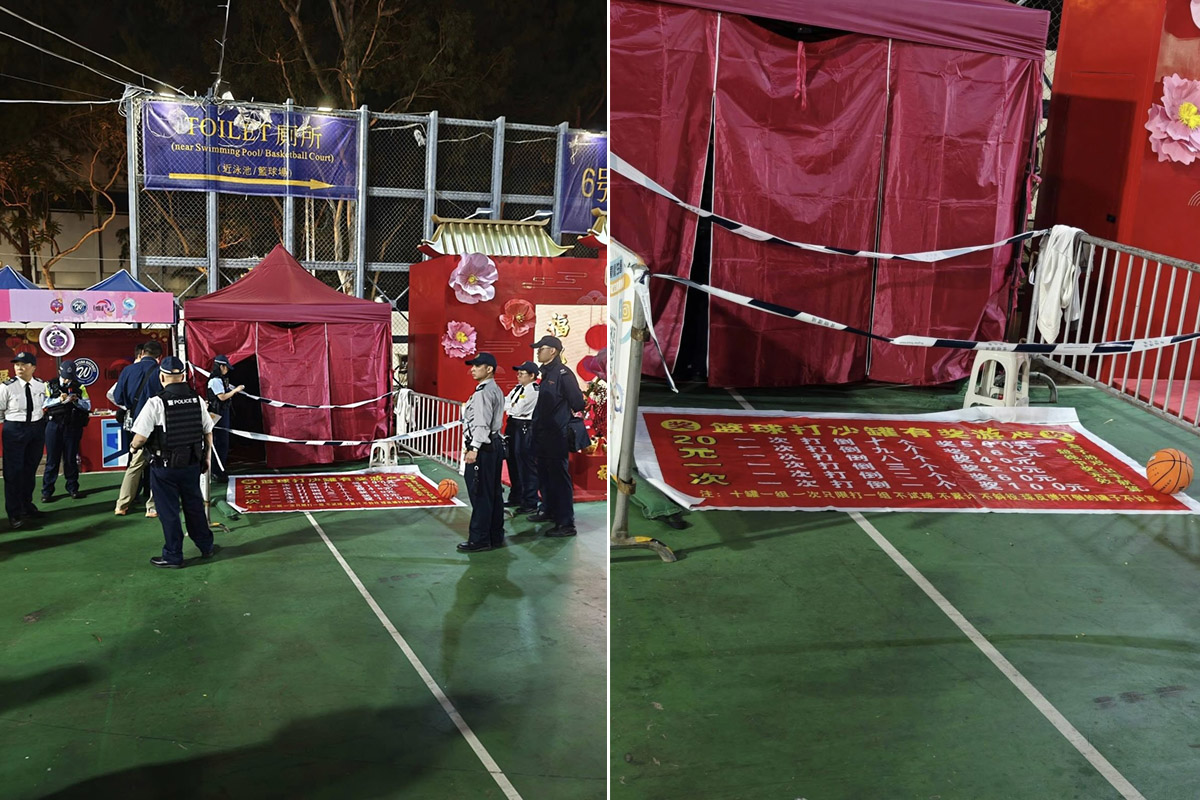 根據網上流傳的相片,涉事檔攤被遮蓋,地面則遺下一個籃球、數張膠凳,以及一幅寫有「籃球打沙罐有獎遊戲」字樣的橫額。該橫額詳細列出了打倒沙罐後相對應可獲取的金額,並標示每次玩樂費用為20元。由於現場環境及橫額內容,一度引起公眾懷疑該攤位涉及非法經營賭博活動。