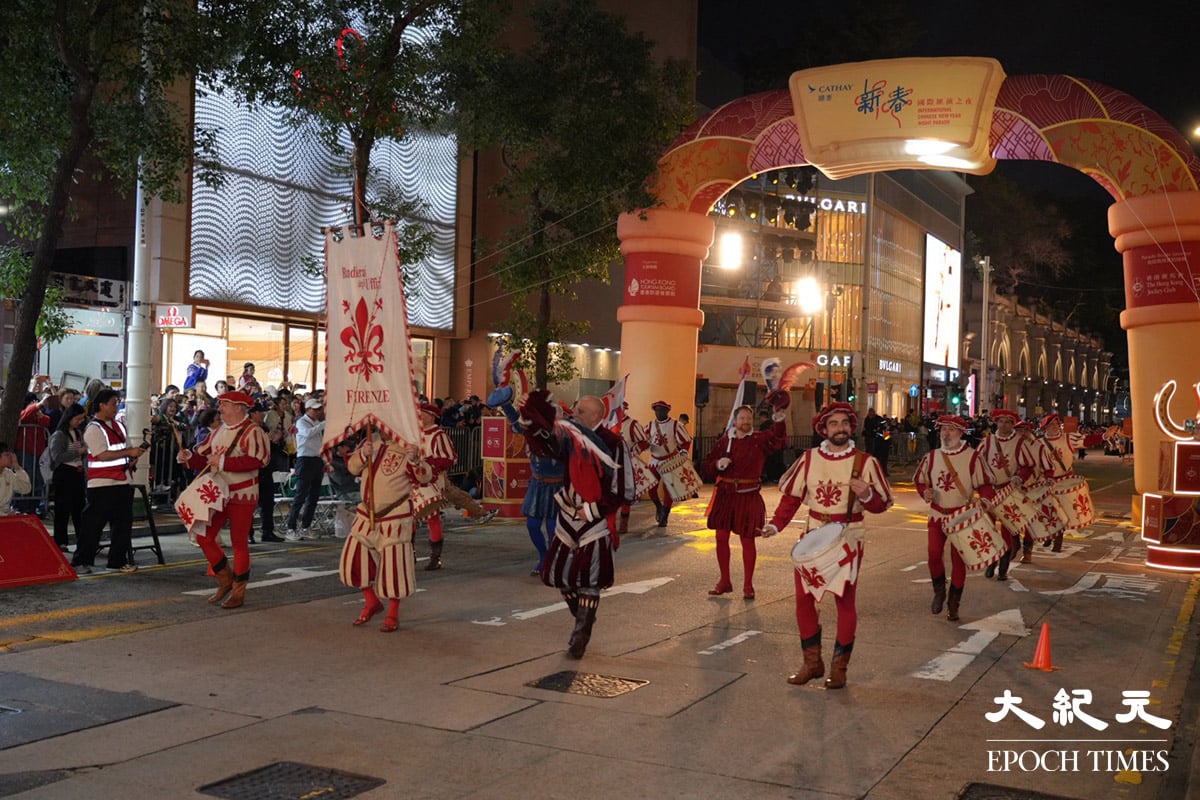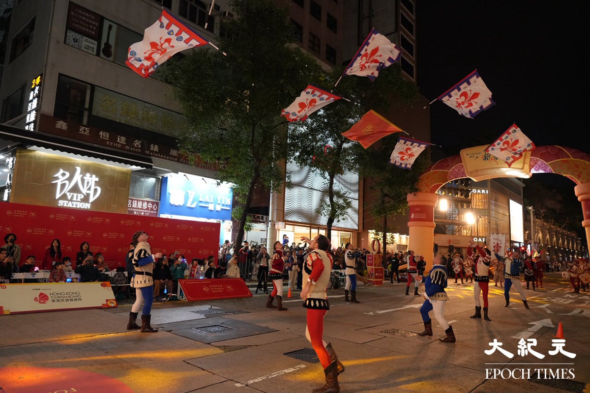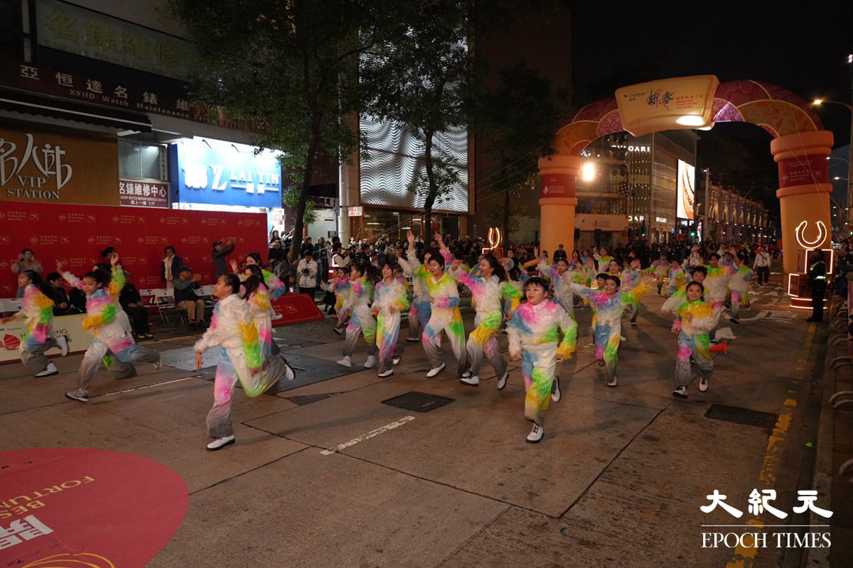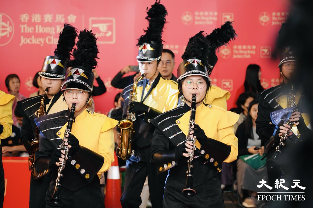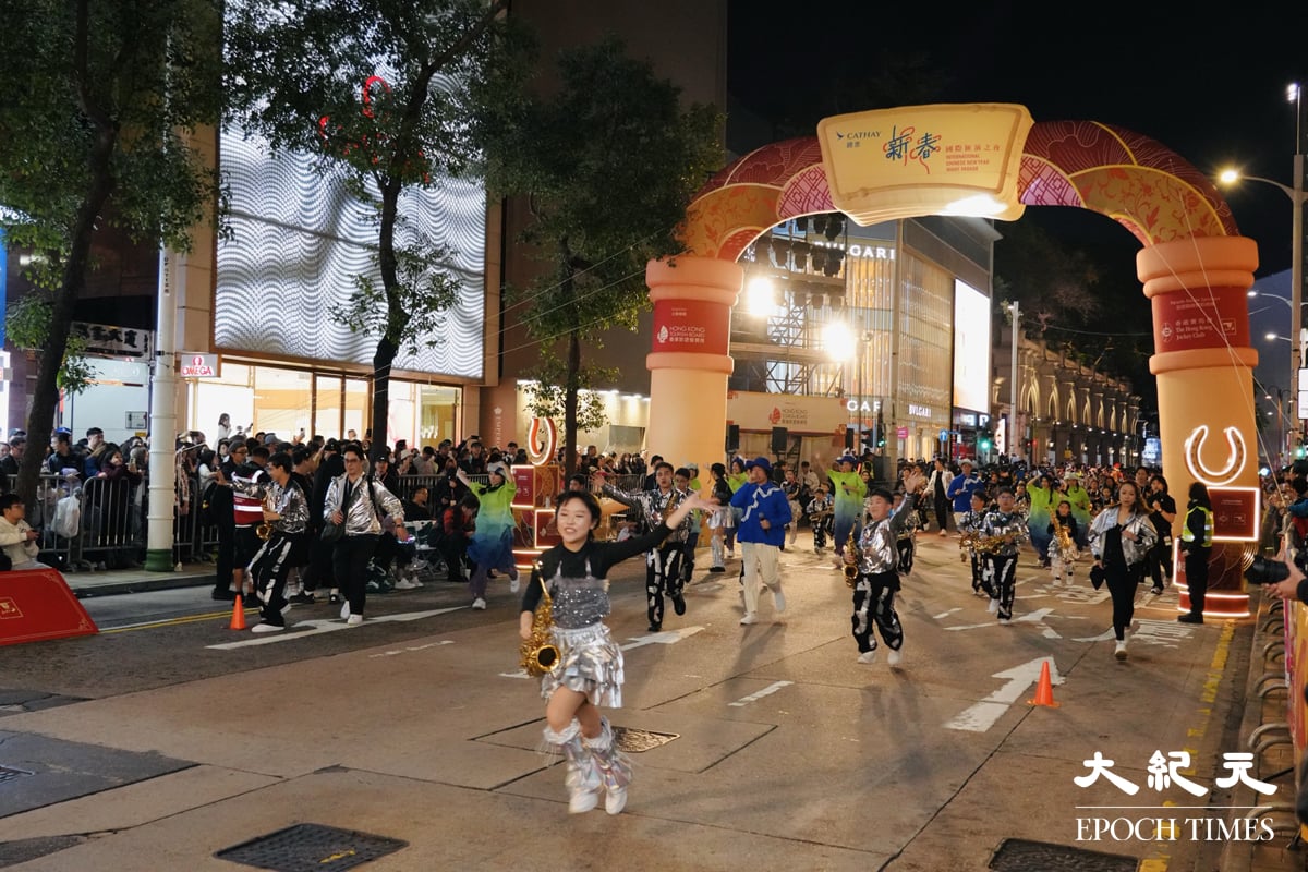 匯演正式開始前,巡遊路線於下午6時起舉行熱身派對。多支本地表演隊伍率先送上繽紛街頭表演。圖為香港少青步操管樂團。(霄龍/大紀元)