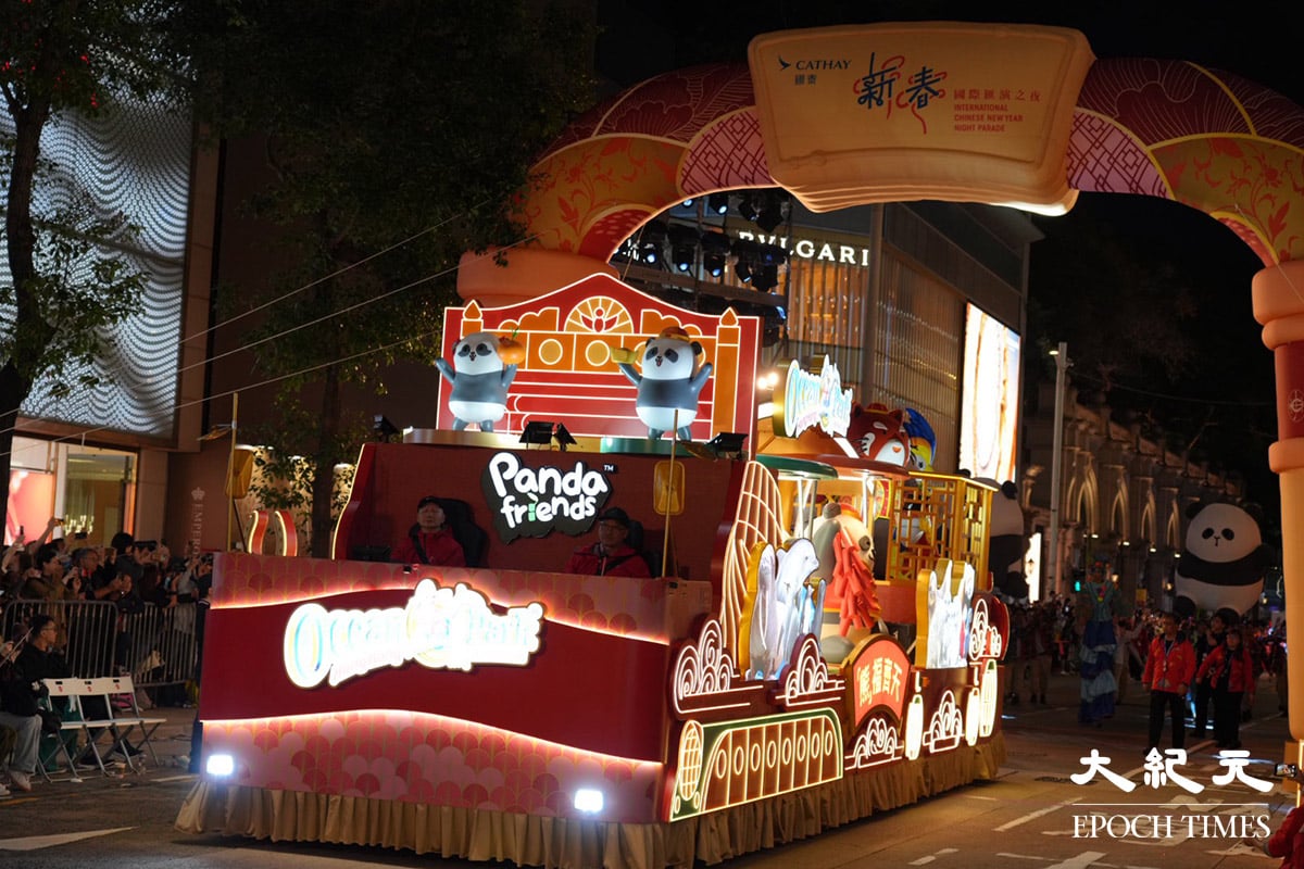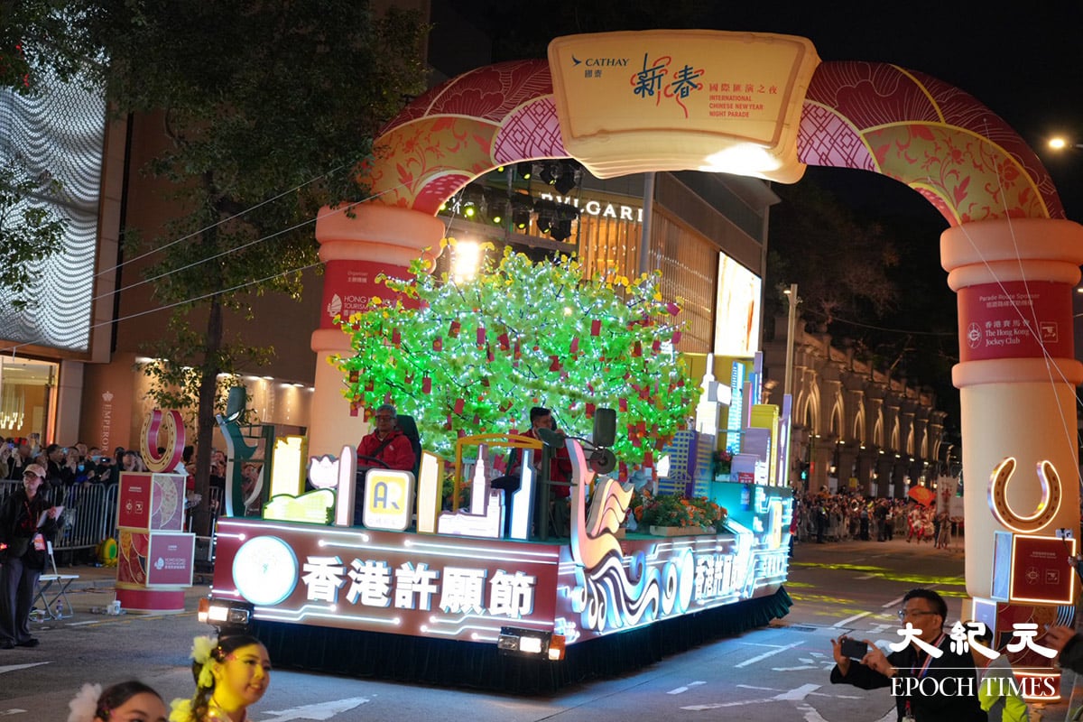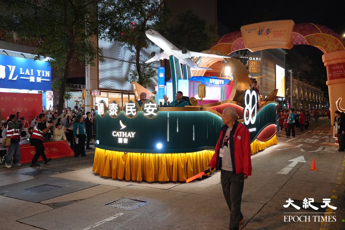 「國泰新春國際匯演之夜」今晚(17日)在尖沙嘴舉行,一共有12輛花車參與。圖為國泰「國泰同心飛躍八十年」花車。(霄龍/大紀元)