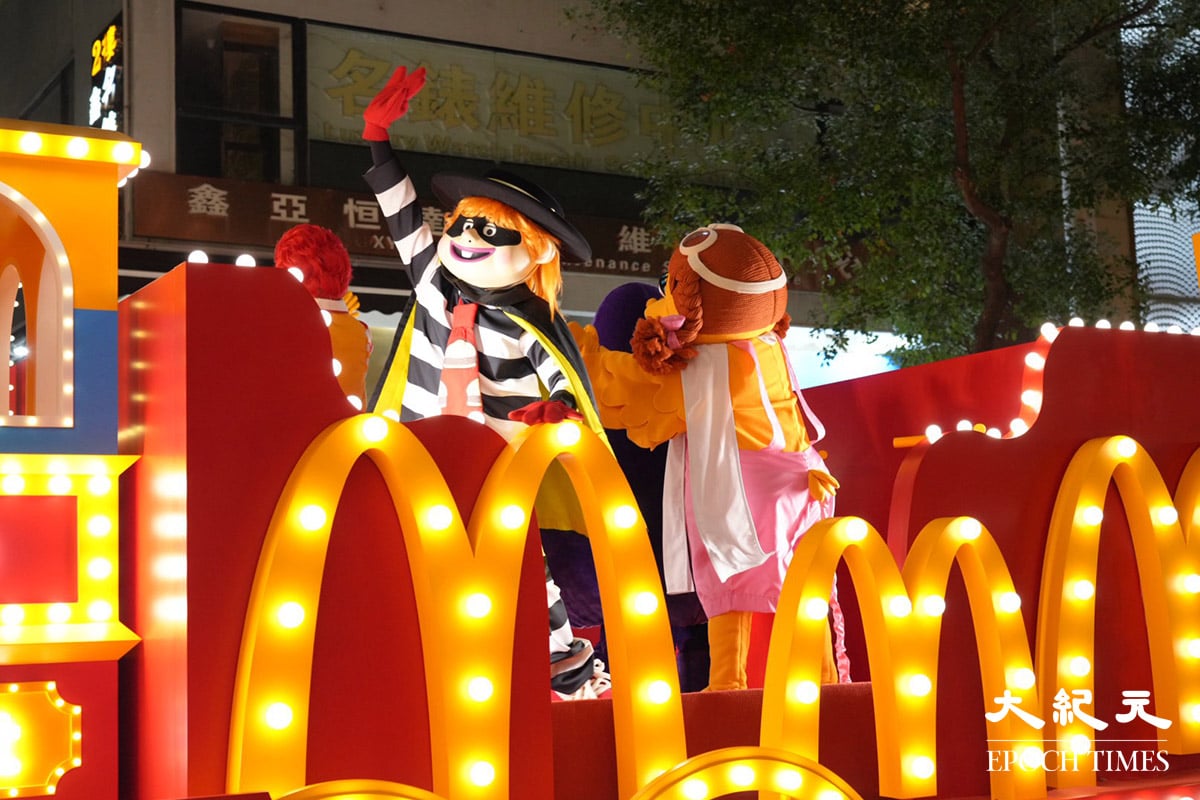 麥當勞樂園角色麥當勞叔叔、滑嘟嘟、小飛飛及漢堡神偷在花車上向觀眾揮手。(霄龍/大紀元)