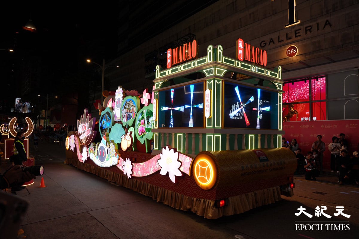 澳門旅遊局花車融合區花荷花與旅遊吉祥物「麥麥」。(霄龍/大紀元)