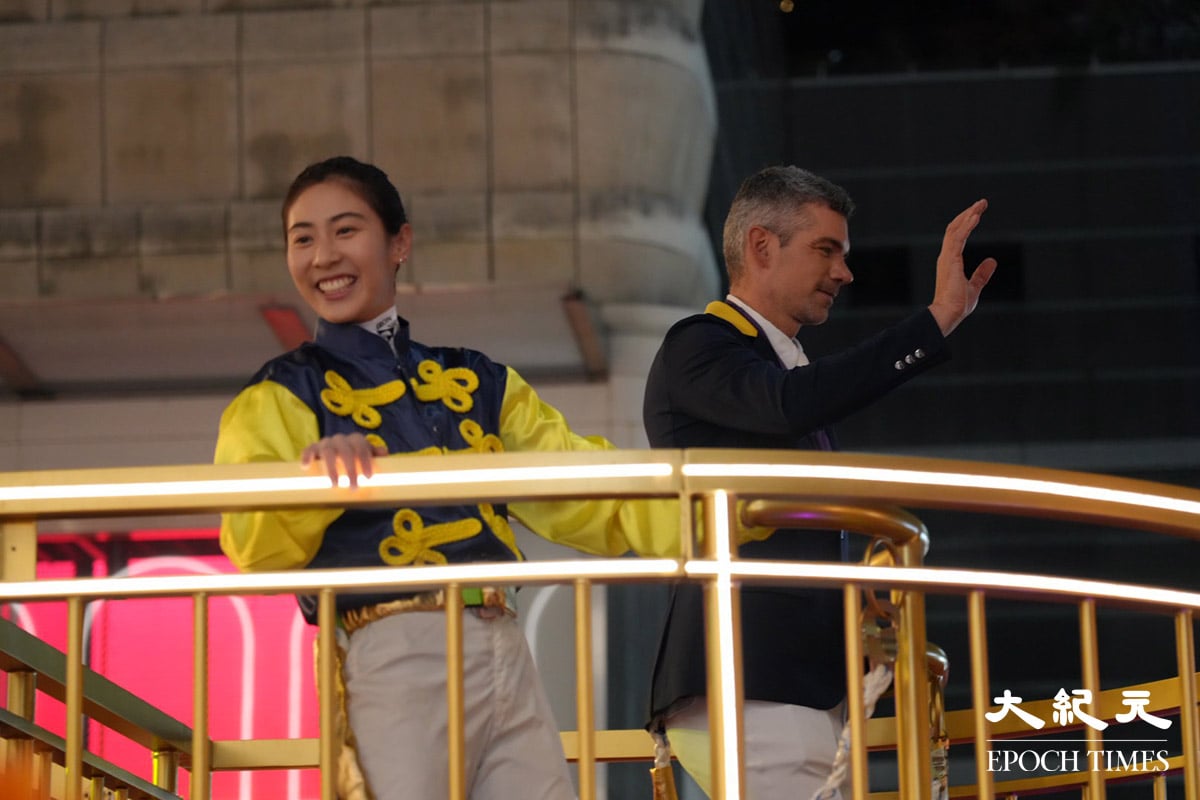 會馬術隊成員、亞洲錦標賽獎牌得主林立信及馬會見習騎師黃寶妮,於花車上亮相。(霄龍/大紀元)