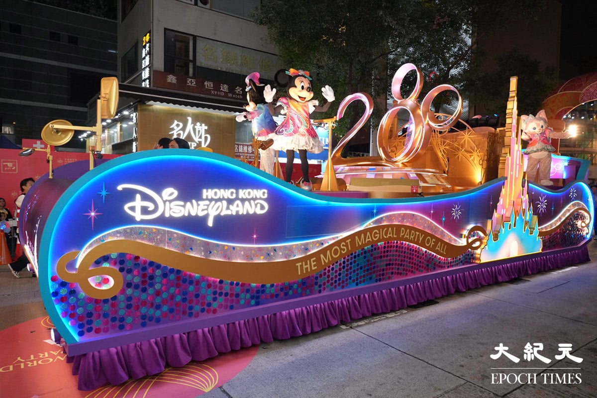 香港迪士尼樂園20周年的花車,以不同周年慶典元素設計。(霄龍/大紀元)