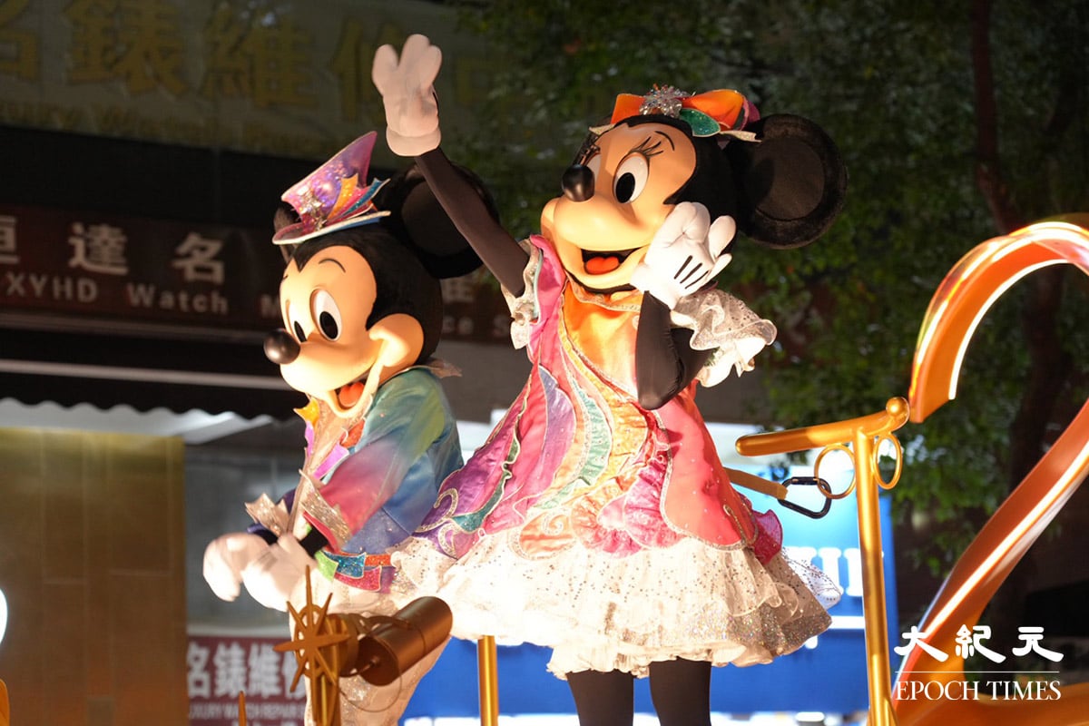 米奇老鼠、米妮老鼠在花車上向觀眾揮手。(霄龍/大紀元)