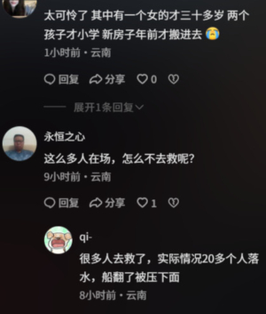 不過,據當地多位網民網上發帖透露,「實際情況是二十多個人落水,船翻了(人)被壓下面」,很多人去救了,最終4人死亡」,「其中有一個女的才三十多歲,兩個孩子才小學,新房子年前才搬進去」。