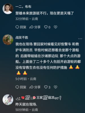 有網民質疑,「難道沒穿救生衣嗎?」當地網民回應,「遊客是附近村民,嫌救生衣髒,不願意穿。」另一網民也證實,船上二十多人,包括開船的在內都沒有穿救生衣,也沒有任何防護措施。#