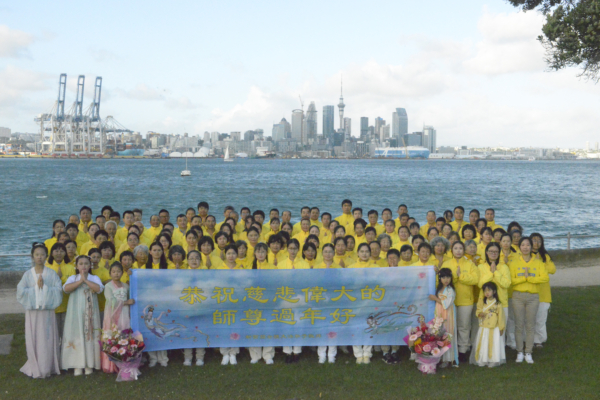紐西蘭部份法輪大法弟子匯聚在奧克蘭著名景點德文波特(Devonport)海濱,恭祝李洪志師父過年好!(古青霄/大紀元)