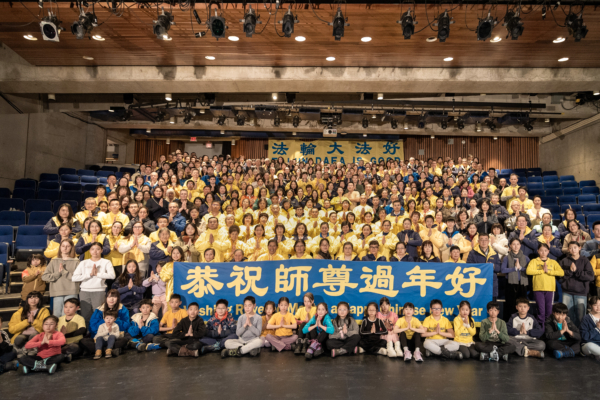 2月13日,大多倫多地區部份法輪功學員匯聚北約克一家圖書館劇院,向李洪志師父表達新年祝福。(張傑瑞/大紀元)