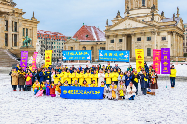 2026年中國新年之際,德國柏林部份法輪功學員恭祝李洪志師父過年好。(張清颻/大紀元)