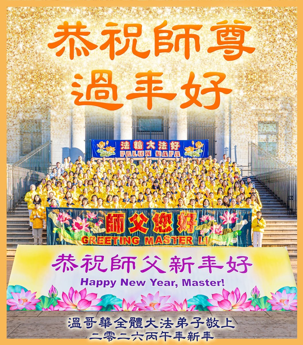 溫哥華法輪功學員向李大師拜年。(明慧網)