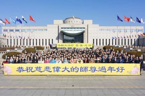 韓國首爾部份法輪功學員匯聚在龍山戰爭紀念館的和平廣場前,向李洪志師父拜年。(金國煥/大紀元)