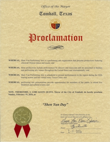 褒獎令寫道:「鑒於,神韻藝術團(Shen Yun Performing Arts)是一個表演藝術團體,呈現以中國古典舞和音樂為特色的演出;以及鑒於,這些製作包含舞蹈演員與音樂家的演出,並在美國各地及國際間的劇院和表演藝術場館上演;以及鑒於,神韻藝術團預定於2026年巡迴演出季期間在本地區上演,且曾造訪德州多個城市;以及鑒於,表演藝術活動為公眾提供參與現場戲劇與文化活動的機會;因此,現在,本人——Tomball City市長Lori Klein Quinn——特此宣布2026年2月15日(星期日)為:「神韻日」。#