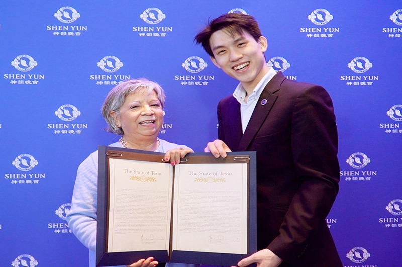 2月15日,德州眾議員Tom Oliverson代表德州政府為神韻頒發決議案,恭祝神韻藝術團成立20周年,歡迎神韻到德州演出。Oliverson辦公室地區主任Grace Handley買票觀看了當天神韻新世界藝術團的演出,並向神韻演員頒發決議案。