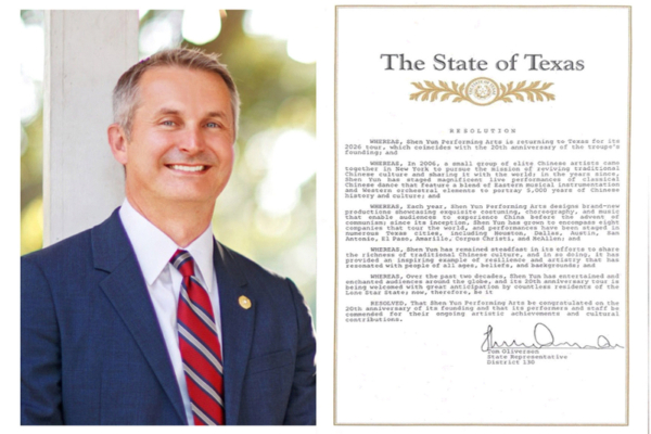 2月15日,德州眾議員Tom Oliverson代表德州政府為神韻頒發決議案,祝賀神韻藝術團成立20周年,並表彰神韻演員和工作人員在藝術成就和文化方面所做出的持續貢獻。