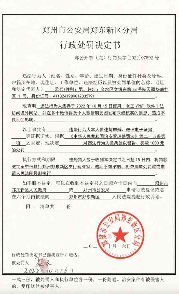 回國之後,他經歷了三年疫情的封控,被封控的滋味讓他無法忍受,在2022年10月份他又開始使用VPN翻墻,不料這次又被警方監控到。10月15日,一幫警察到他家裏將他帶走,聲稱他非法訪問境外網站,並且在多個微信群裏發「不實」消息,孟兵當時擔心警方不放他回家,在派出所裏進行自殘,最終被罰款1000元後當晚獲釋。