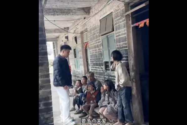 影片畫面顯示,5個小孩坐在門外凳子上,他們家中環境簡陋,孩子們身上穿的衣服和鞋子破舊不堪。最小的孩子光腳,還有小孩穿著塑膠拖鞋。