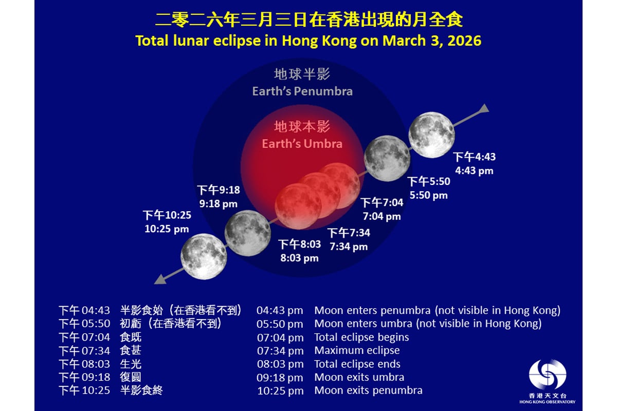 天文台今日(20日)預告,下月3日(星期二)傍晚,香港上空將出現月全食。若天氣情況許可,市民可以肉眼直接觀賞月全食過程,面向東方而沒有障礙物的地點都適合觀賞這次月食。