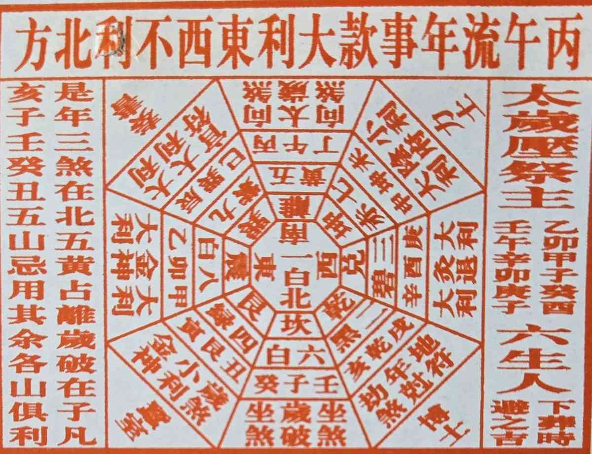 一命二運三風水,除了上述的流年會影響一個人的運程外,大運和風水之力的影響也是很大的,由於每個人的大運都不同,不能在此一一論及。但在今年的《通勝》(老黃曆、皇曆)中,可以看到一幅「丙午流年事款大利東西不利北方」的圖。