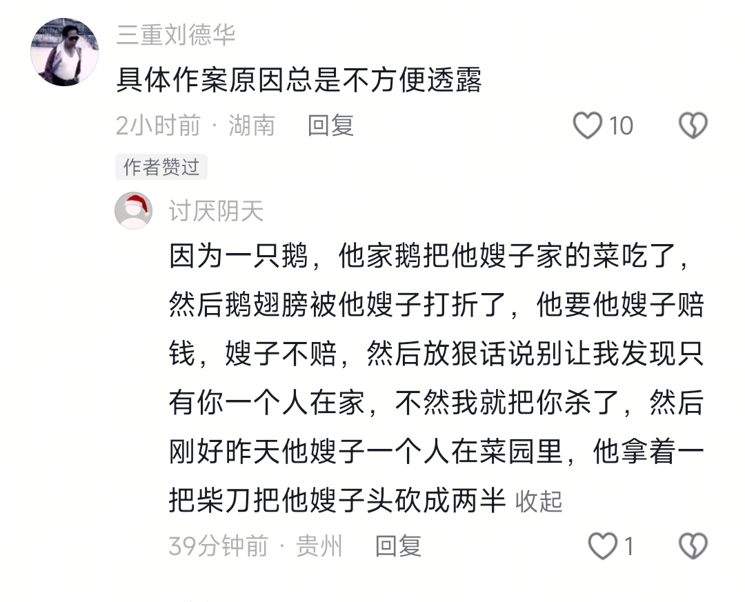 據當地多位網民發帖爆料,嫌疑人劉述期餵養的鵝把他嫂子家菜園裏的菜吃了,鵝翅膀被他嫂子打折,劉述期要他嫂子賠錢,他嫂子不賠,於是伺機持柴刀把他嫂子砍了。