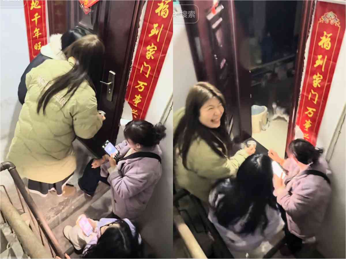 網傳影片顯示,女主人在門外喊:「奈斯,開門。」然後,就聽見「啪嗒」一聲,大門被打開了,一家人一陣歡呼。