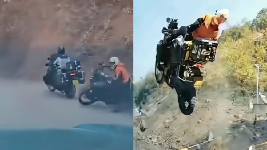 大年初二,一女子騎摩托行駛在雲南山路上,因道路顛簸,一個誤操作連摩托帶人凌空飛下山坡。網民調侃這是上演「飛馳人生」。