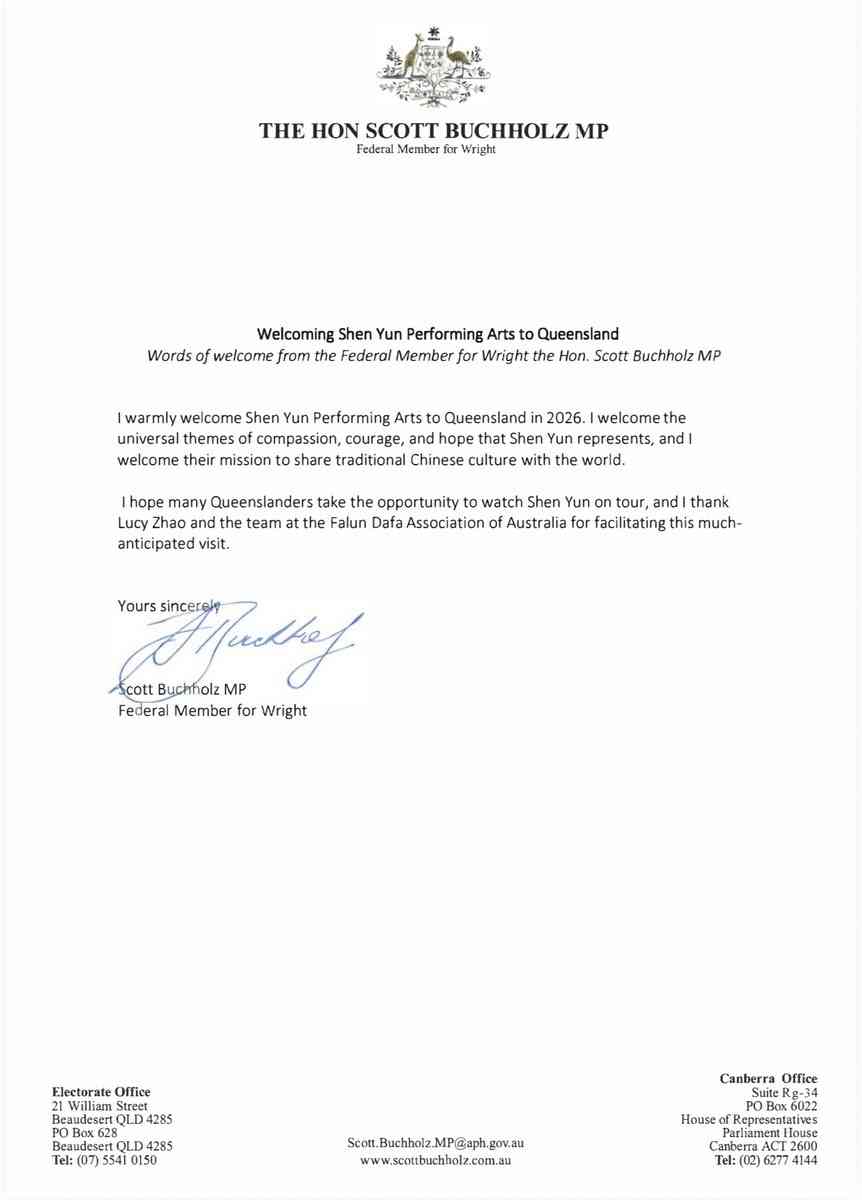 來自昆州的聯邦議員巴克霍爾茲(Scott Buchholz)日前發出賀信,熱烈歡迎神韻藝術團到訪昆州。