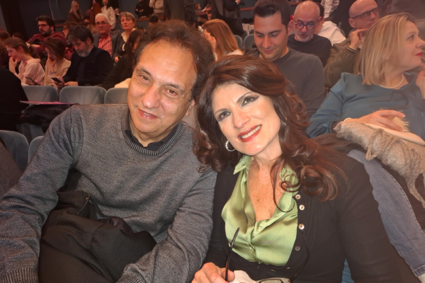 2026年2月21日晚,大提琴手、室內樂團創辦人Liberato Sant Arpino和音樂學校校長Giovanna Lovine觀賞神韻演出。(Francesca Rotondi/大紀元)