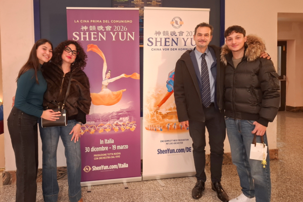 2026年2月21日晚,古典鋼琴家Francesco Silvestri(右一)和太太Lucia Pugli帶著兩個孩子觀賞了神韻演出。(Francesca Rotondi/大紀元)