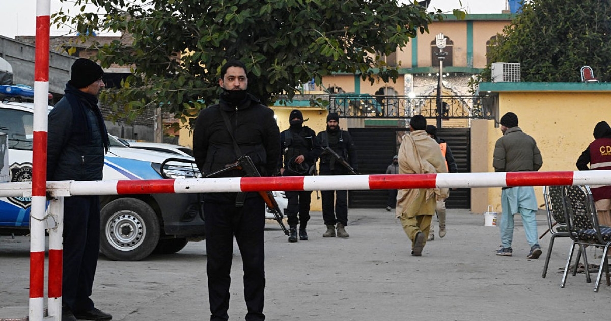 2026年2月7日,伊斯蘭馬巴德一座什葉派清真寺發生自殺式炸彈攻擊,事發第二天,警方在現場站崗。 2月6日,伊斯蘭馬巴德一座什葉派清真寺發生自殺式爆炸,造成數十人死亡。一名在清真寺做禮拜的信徒描述說,祈禱開始後不久,一場「威力極其巨大的」爆炸撕裂了整座建築。(Aamir QURESHI / AFP via Getty Images)