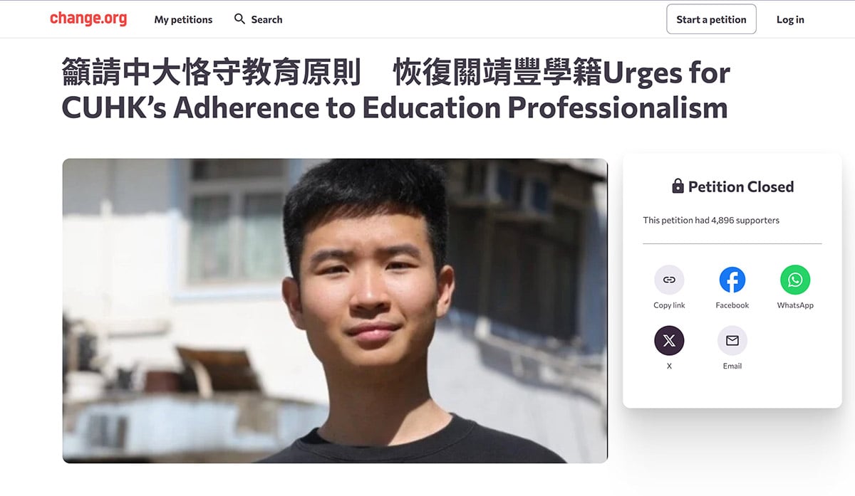 事件曝光後,一群名為「關心香港學生成長及福祉」的人士發起網上聯署,要求中大撤回決定,並恢復關靖豐的學生資格。聯署今日(23日)結束,共有4,869人參與。