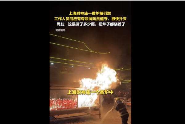 今年是火馬年,中國新年期間,各類事故頻發。山西五台山大年初五(2月21日)發生山火,同天全國還有多地發生山火。上海財神廟在凌晨時間,一個爐子被燒著,需專職消防員撲滅,廟方回應稱是「澆水降溫」,引發網民譏諷。