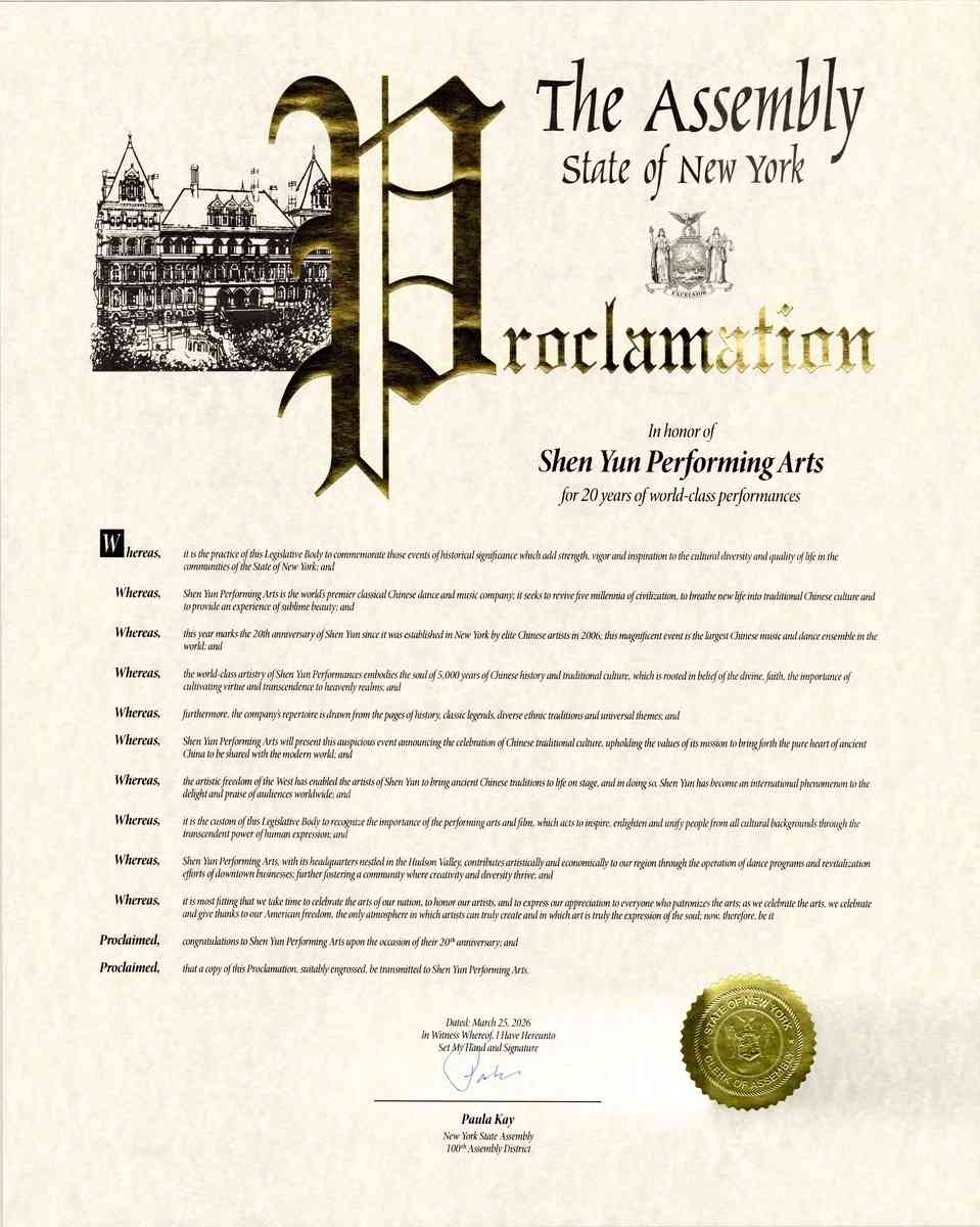 在神韻藝術團下個月蒞臨紐約州巡迴演出前夕,多位紐約州民選代表特別致函祝賀,恭賀神韻藝術團成立二十周年,並感謝其多年來為紐約人民與社區所做出的卓越貢獻。來信中,他們熱烈歡迎神韻再次來到紐約州演出,並預祝神韻二〇二六年巡迴演出圓滿成功。