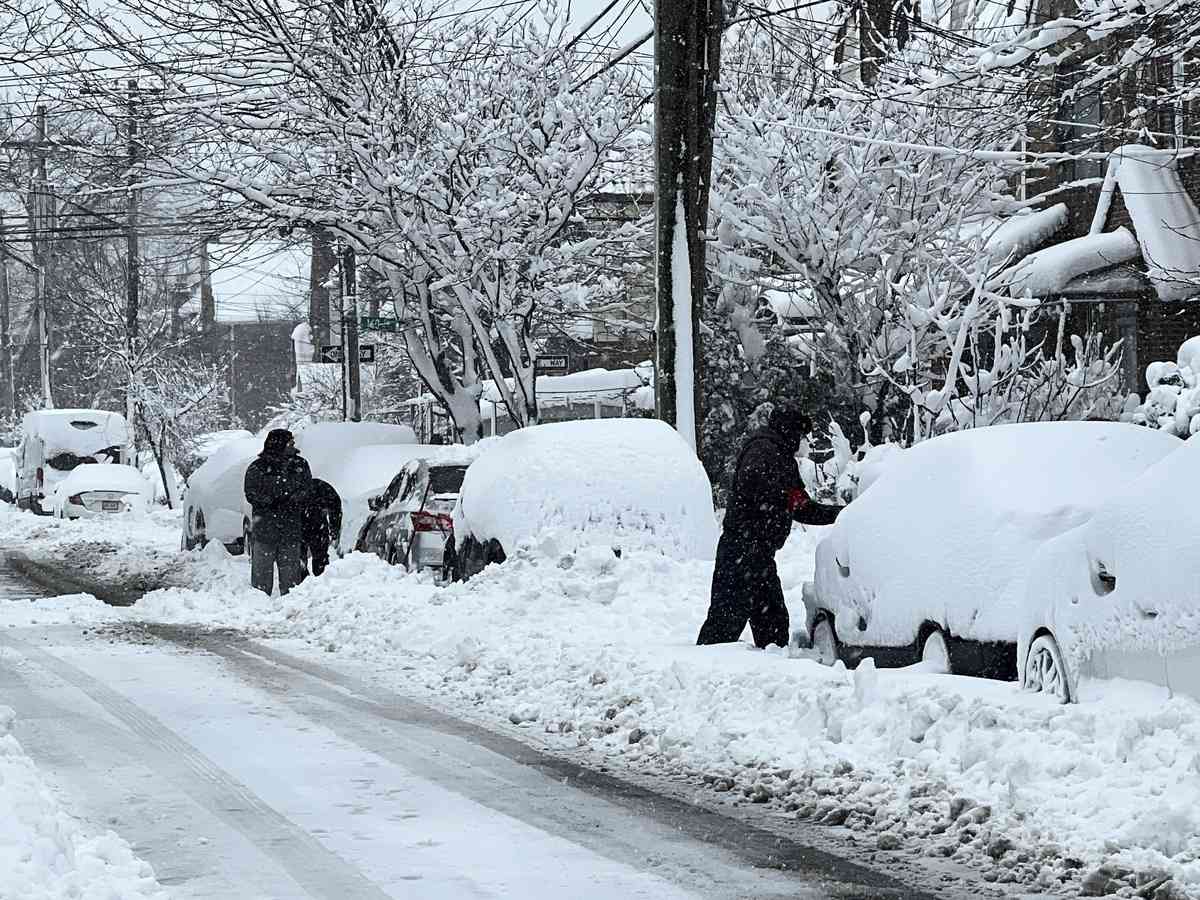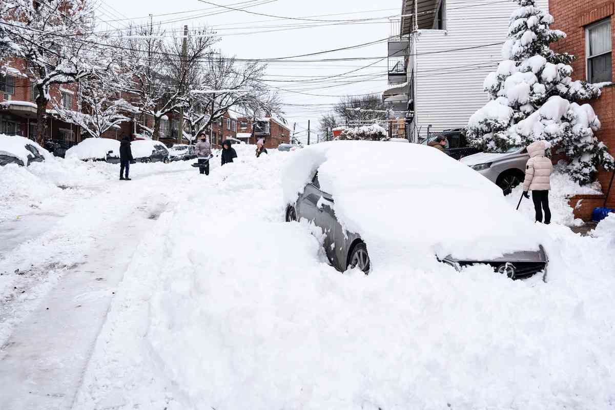 2026年2月23日,紐約市法拉盛遭暴風雪襲擊,汽車被大雪掩埋,居民在鏟雪。(林丹/大紀元)