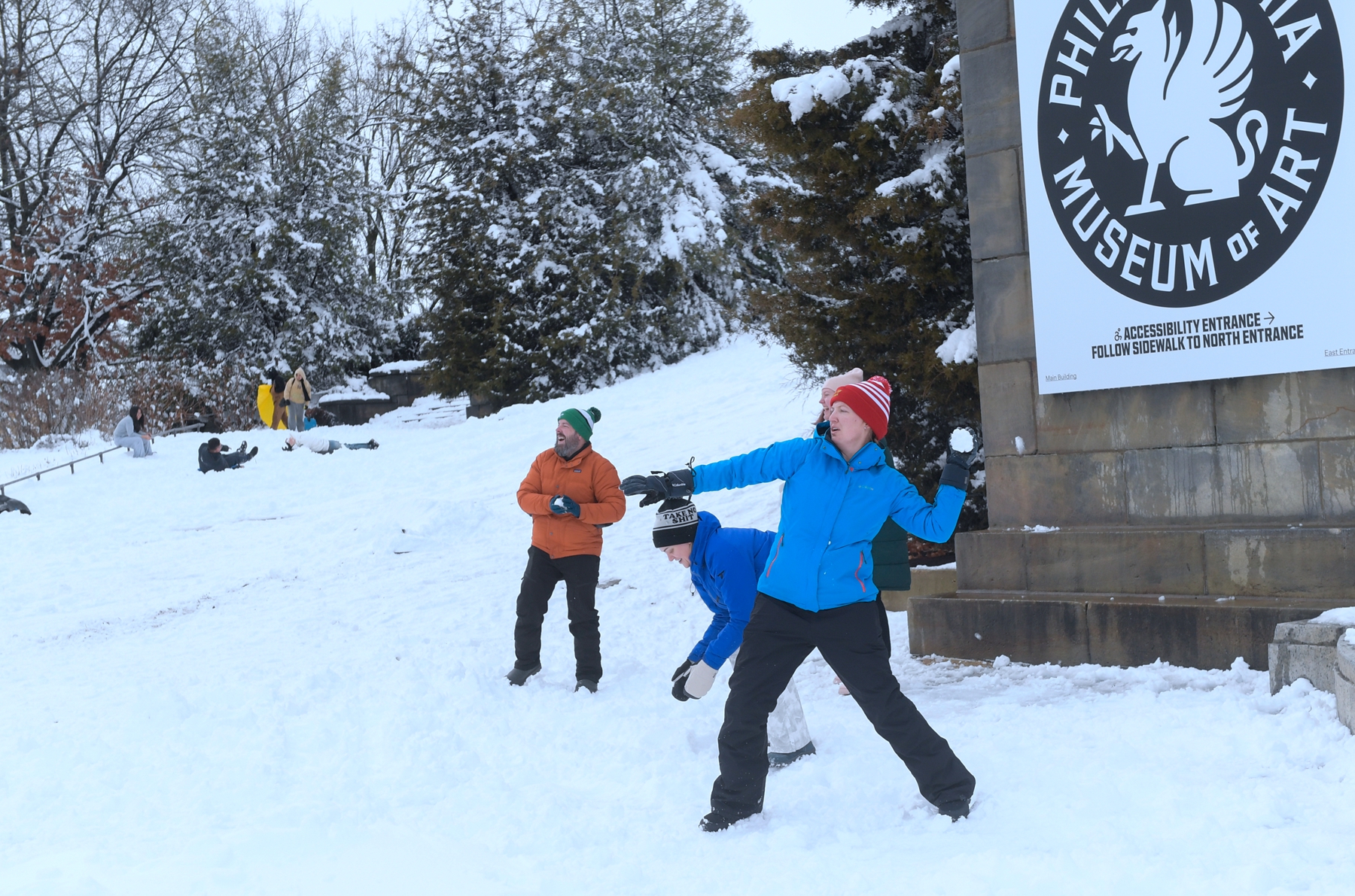 2026年2月23日,賓夕凡尼亞州費城遭暴風雪襲擊,當地居民在費城藝術博物館前玩打雪仗。(Matthew Hatcher/Getty Images)