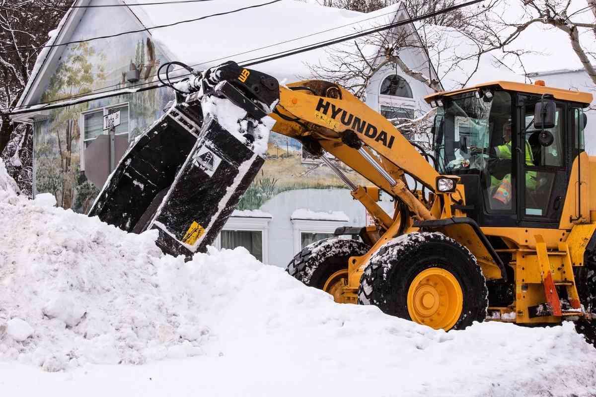 2026年2月23日,紐約州皮埃蒙特(Piermont)遭暴風雪襲擊,一台挖掘機清理主街上的積雪。(Kena Betancur/Getty Images)