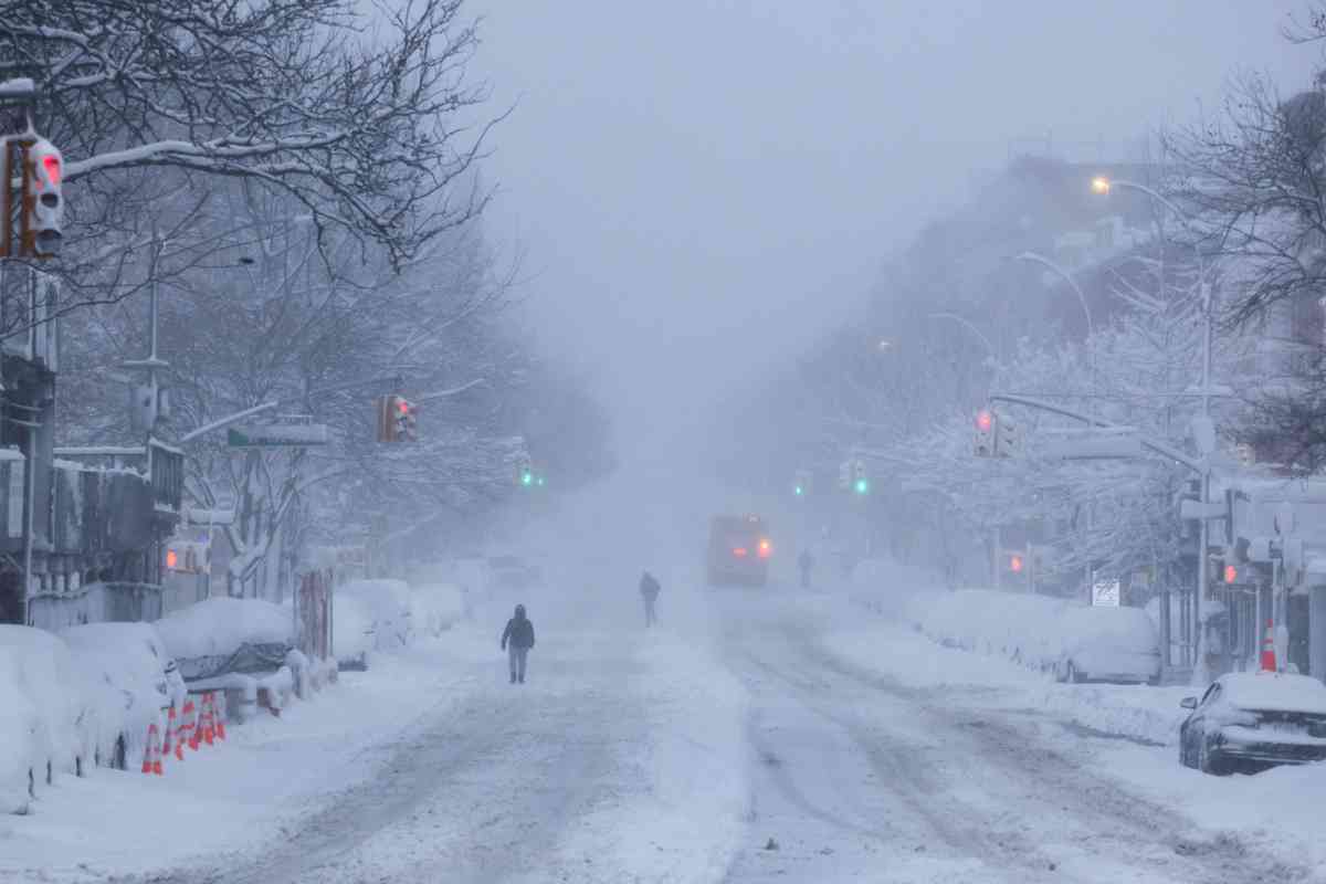 2026年2月23日,紐約市布魯克林區的弗拉特布殊(Flatbush)社區,暴風雪期間積雪落下,民眾走在被雪覆蓋的街道上。(Michael M. Santiago/Getty Images)