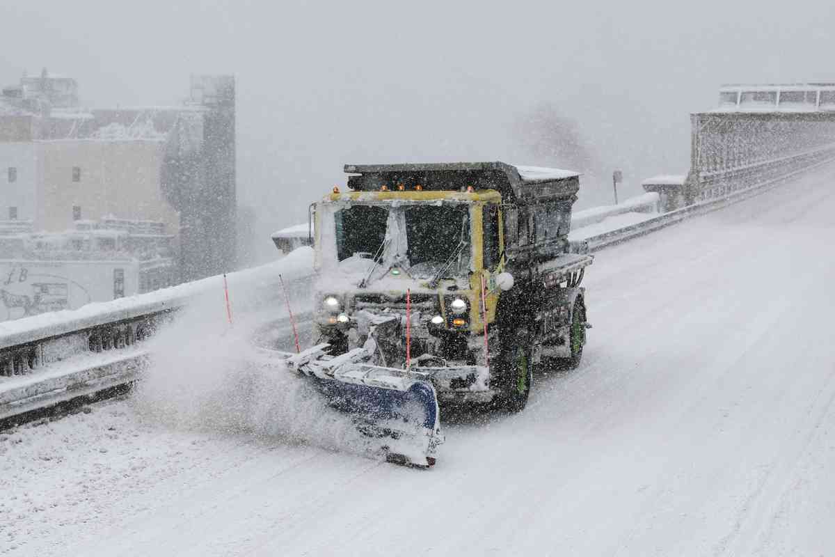 2026年2月23日,一輛鏟雪車在布魯克林大橋上清理積雪。(Angela Weiss/AFP via Getty Images)
