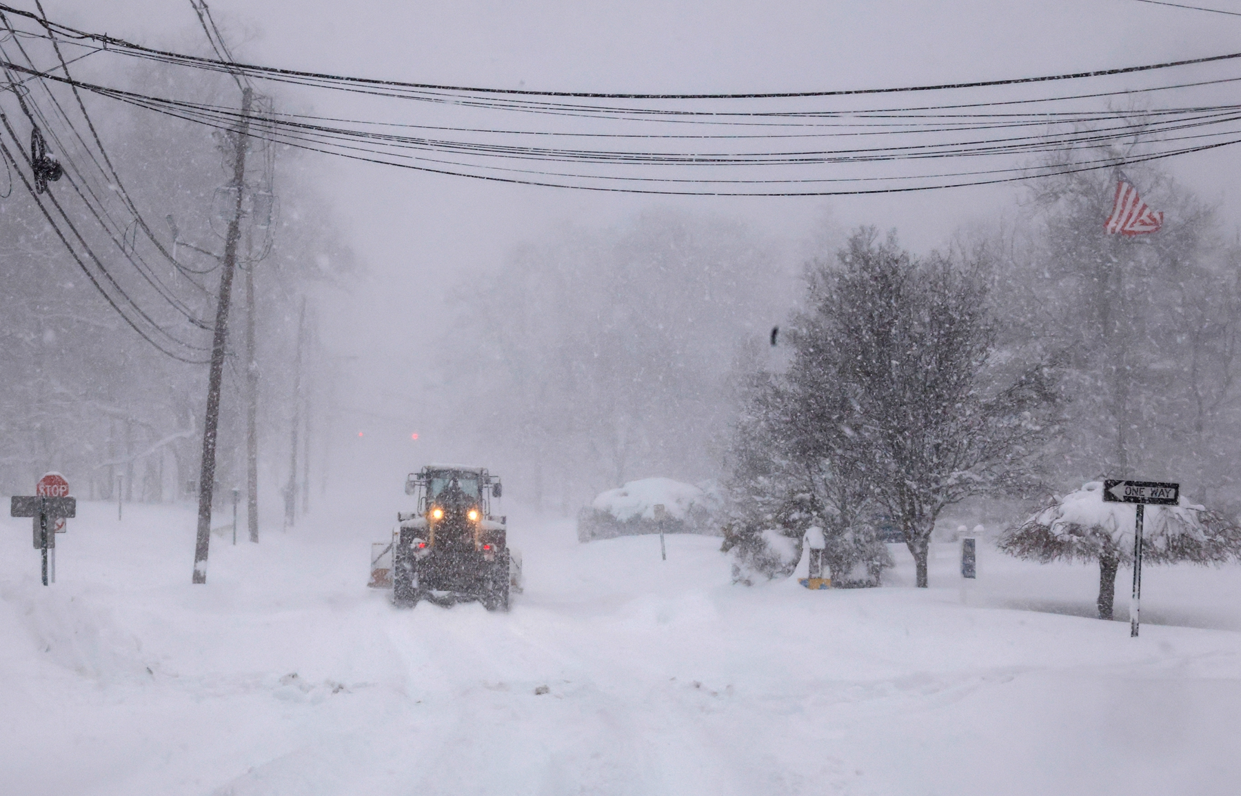 2026年2月23日,新澤西州諾伍德(Norwood)遭暴風雪襲擊,一台挖掘機清理主街上的積雪。(Kena Betancur/Getty Images)