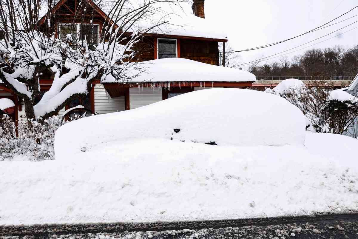 2026年2月23日,紐約州皮埃蒙特(Piermont)遭暴風雪襲擊,一輛汽車被厚厚的積雪掩埋。(Kena Betancur/Getty Images)