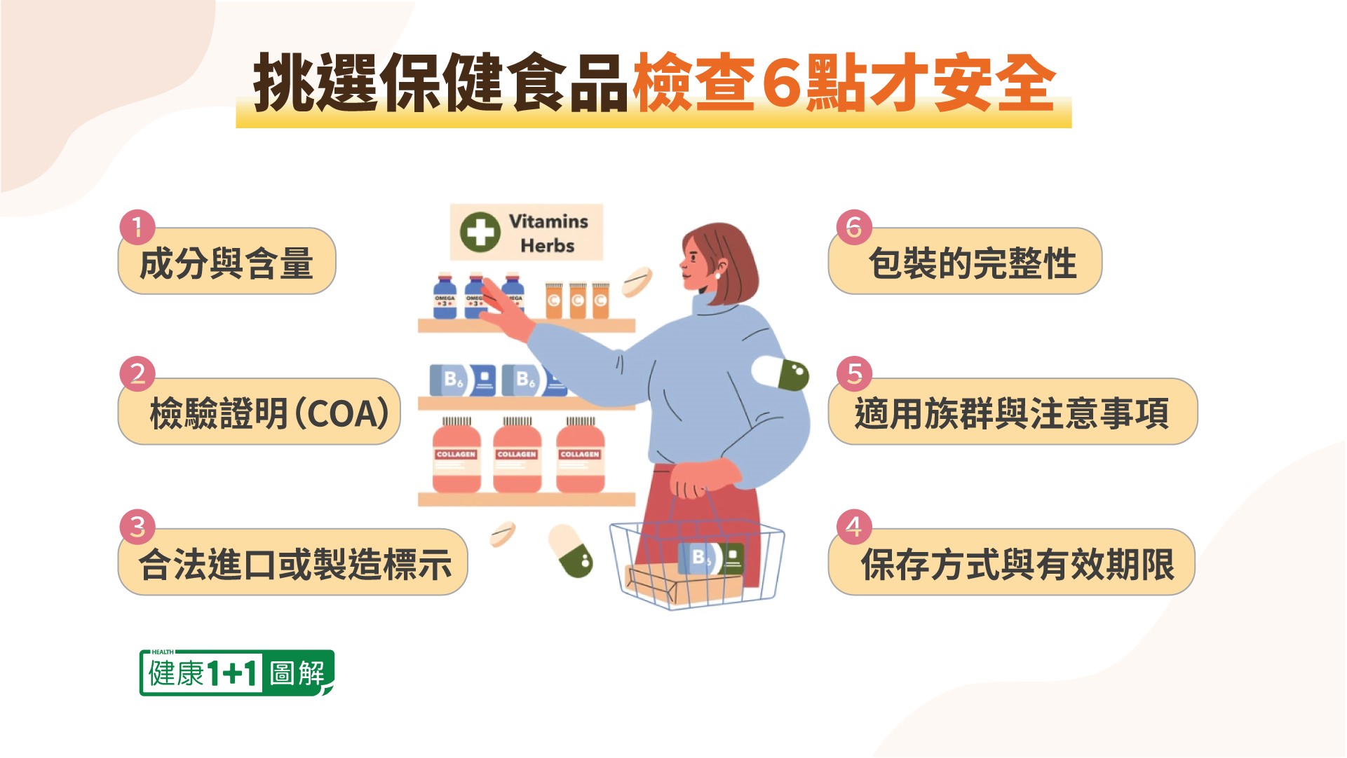 陳佳玲藥師提醒,如有這些情況,在服用保健品前應該請專業人員評估:肝腎功能不佳、癌症化療、免疫功能不全、手術前後、長期服用慢性病藥物以及有重病者。