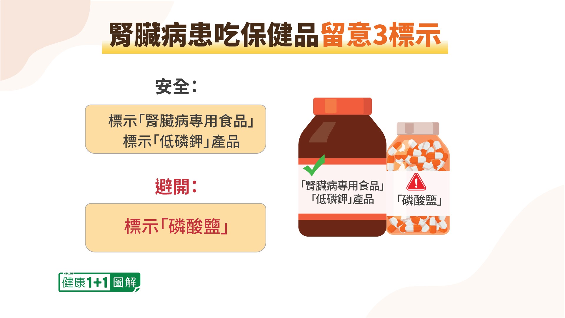 對腎臟病患者來說,風險更需要「先看得見」。陳佳玲提醒,若產品標示不清,腎臟病患者可能誤吃到高鉀、高磷、高蛋白等成份而加重負擔。她建議優先挑選標示清楚的「磷鉀友善」、「低鉀」、「低磷」的產品,如果成份表看到「磷酸鹽」,就要提高警覺,務必詢問醫師或藥師。