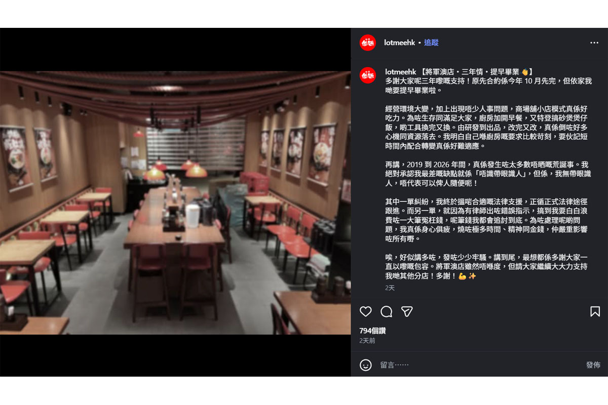 開業三年的本地拉麵店「樂麵」,店主日前於社交平台宣布,原定今年10月約滿的將軍澳店,因經營環境轉變及人事問題,決定提早結業。