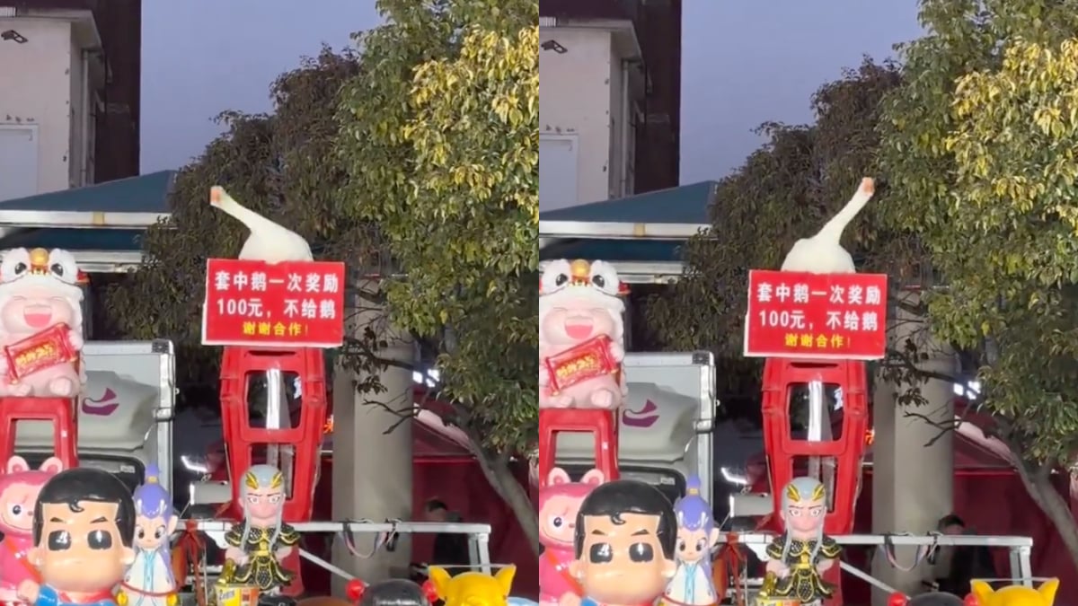 網傳影片顯示,中國新年期間,安徽一個套大鵝的攤位上,一隻音樂「搖擺鵝」吸引過往遊客注意。