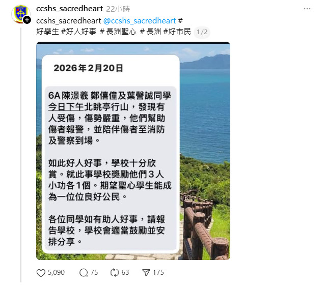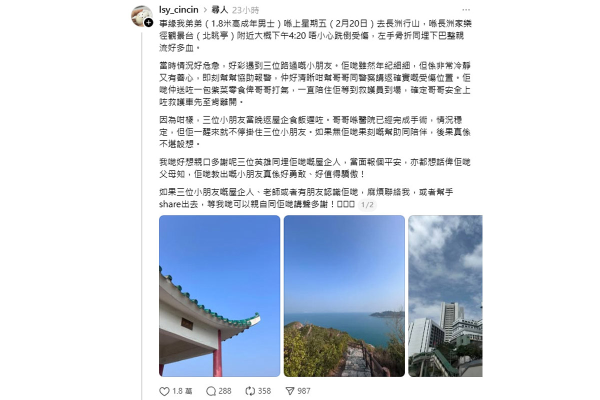 昨日(25)有網民發文表示,她的弟弟日前在長洲行山時不慎跌倒受傷,情況一度危急,幸獲3名小童即時協助報警及陪伴,最終順利送院治療。她將事件分享到Threads上,希望能尋找到3人,當面致謝。長洲聖心學校在該帖文底下留言表示,事發當天校方得知此事,已經表揚上述3位學生,並表示事主可聯繫校方,學校會請班主任協調與3名小朋友及家長會面。