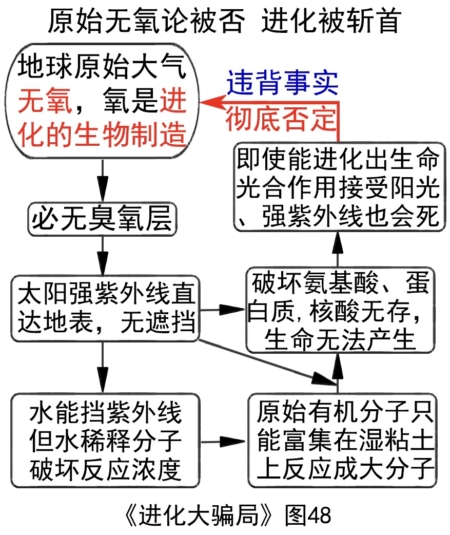 假設地球原始大氣無氧,那麼就不可能有臭氧層存在(臭氧主要是紫外線照射氧氣生成的),太陽強烈的紫外線,就能直達地表(臭氧層吸收大量紫外線,保護地球生命)。紫外線有強烈的殺菌作用,破壞胺基酸、破壞蛋白質、破壞基因核酸分子,這樣,作為生命基礎的大分子就無法產生,更無法進化出基本的生命了。縱然真進化出來一個原始細菌,也會被紫外線殺死。沒有生命,就無法光合作用產生氧氣,地球大氣層就會一直無氧氣,也無生命——地球無氧論就陷入了自相矛盾(認為生命產生氧氣)、與事實矛盾的死路。