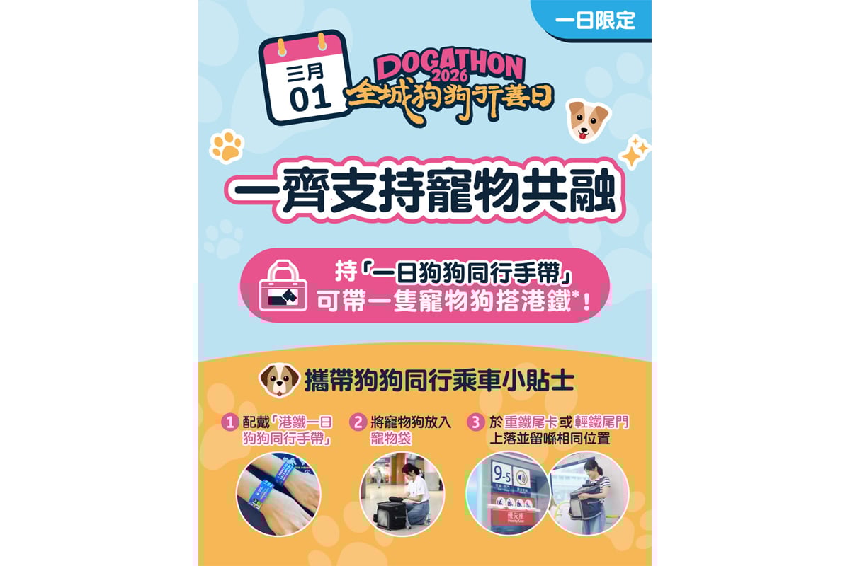 港鐵為了響應愛護動物協會舉辦的「全城狗狗行善日」,於本周日開放1,200名已登記及捐款的參加者攜帶一隻寵物狗,乘搭港鐵重鐵路綫和輕鐵,但不包括機場快綫、香港西九龍站、馬場站、羅湖站、落馬洲站、港鐵巴士及接駁巴士。