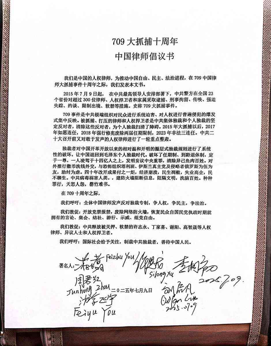為反對中共獨裁統治,呼籲國際社會的關注,他們還發表了《中國律師倡議書》。