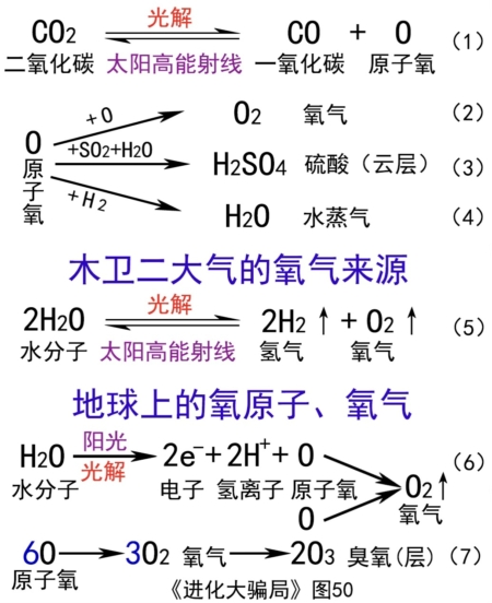 光解這種光化學反應,不可能只發生在金星和木衛二,在地球上也一定存在。上圖光解方程(6),不止發生在植物的光合作用中,在植物以外的自然界也有,是大氣中的光化學反應。(注意:植物光合作用吸收CO2釋放O2,這裏的氧氣O2並不來源於CO2,而是來源於水H2O!CO2直接被植物吸收、轉化、利用了,是水H2O被太陽光能光解,產生氧氣O2和H離子,H離子也被植物吸收、利用了。)