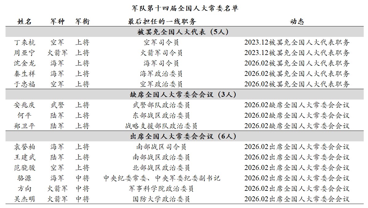 自媒體《中國人事觀察》2026年2月26日在社交平台X發帖,截圖呈現中共央視報道中僅有6名軍隊人大常委會委員出席閉幕會的畫面;並披露這次全國人大常委會會議上,除了沈金龍、秦生祥、于忠福3名上將被罷免人大代表,撤銷全國人大常委會委員職務,另有3名軍隊人大常委會委員缺席會議,分別為東部戰區原政委、陸軍上將何平,原戰略支援部隊政委、陸軍上將鄭衛平,武警部隊原政委,武警上將安兆慶。