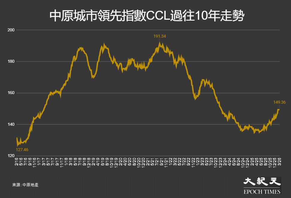 追蹤香港二手樓價的中原城市領先指數CCL於6日公布最新的數值為149.36點,截至3月1日,按周指數下降0.03%,此乃連續上漲五個星期後,首見輕微回落;指數按月仍升1.45%,自疫情爆發以來(2020年1月26日起)跌15.89%,而3年的累積跌幅為9.05%。大型、中小型單位按周分別錄得下降0.09%、降0.02%,3年累積跌10.50%、跌8.77%。